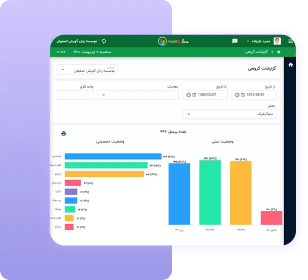 - مشاهده گزارش جامع سازمانی و آمارهای متنوع و جذاب با هدف درک بهتر وضعیت سلامت پرسنل